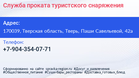 Служба проката туристского снаряжения по адресу 170039, Тверская область, Тверь, Паши Савельевой, 42а в дальнейшем Организация, размещена в следующих категориях: