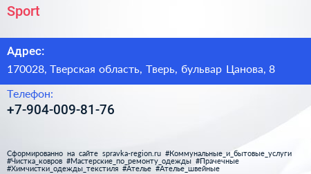 Sport+ по адресу 170028, Тверская область, Тверь, бульвар Цанова, 8 в дальнейшем Организация, размещена в следующих категориях: