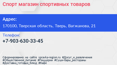 Спорт, магазин спортивных товаров по адресу 170100, Тверская область, Тверь, Вагжанова, 21 в дальнейшем Организация, размещена в следующих категориях: