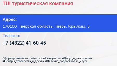 TUI, туристическая компания по адресу 170100, Тверская область, Тверь, Крылова, 5 в дальнейшем Организация, размещена в следующих категориях: