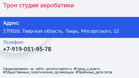 Трон, студия акробатики по адресу 170026, Тверская область, Тверь, Мусоргского, 12 в дальнейшем Организация, размещена в следующих категориях: