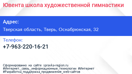 Ювента, школа художественной гимнастики по адресу Тверская область, Тверь, Оснабрюкская, 32 в дальнейшем Организация, размещена в следующих категориях: