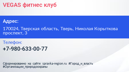 VEGAS, фитнес-клуб по адресу 170024, Тверская область, Тверь, Николая Корыткова проспект, 3 в дальнейшем Организация, размещена в следующих категориях: