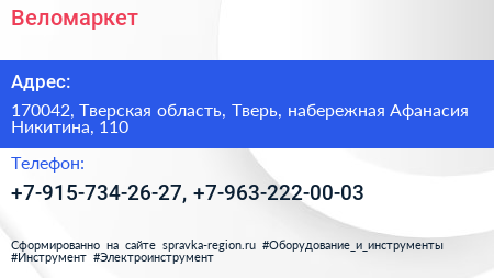 Веломаркет по адресу 170042, Тверская область, Тверь, набережная Афанасия Никитина, 110 в дальнейшем Организация, размещена в следующих категориях: