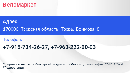 Веломаркет по адресу 170006, Тверская область, Тверь, Ефимова, 8 в дальнейшем Организация, размещена в следующих категориях: