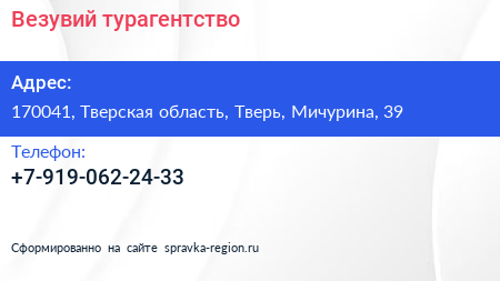 Везувий, турагентство по адресу 170041, Тверская область, Тверь, Мичурина, 39 в дальнейшем Организация, размещена в следующих категориях: