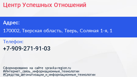 Центр Успешных Отношений по адресу 170002, Тверская область, Тверь, Соляная 1-я, 1 в дальнейшем Организация, размещена в следующих категориях: