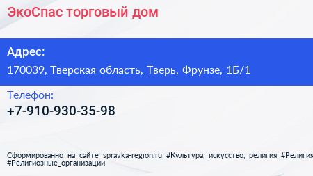 ЭкоСпас, торговый дом по адресу 170039, Тверская область, Тверь, Фрунзе, 1Б/1 в дальнейшем Организация, размещена в следующих категориях: