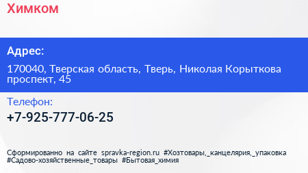 Химком по адресу 170040, Тверская область, Тверь, Николая Корыткова проспект, 45 в дальнейшем Организация, размещена в следующих категориях: