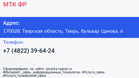 МТК ФР по адресу 170028, Тверская область, Тверь, бульвар Цанова, 6 в дальнейшем Организация, размещена в следующих категориях: