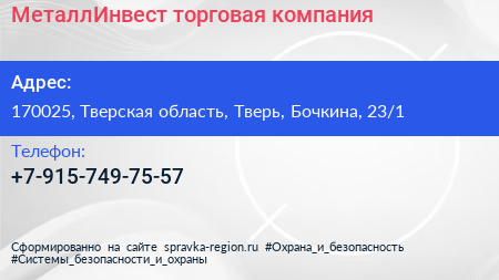 МеталлИнвест, торговая компания по адресу 170025, Тверская область, Тверь, Бочкина, 23/1 в дальнейшем Организация, размещена в следующих категориях: