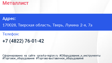 Металлист по адресу 170028, Тверская область, Тверь, Лукина 2-я, 7а в дальнейшем Организация, размещена в следующих категориях: