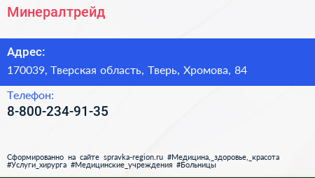 Минералтрейд по адресу 170039, Тверская область, Тверь, Хромова, 84 в дальнейшем Организация, размещена в следующих категориях: