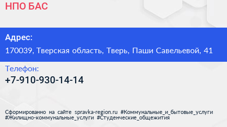 НПО БАС по адресу 170039, Тверская область, Тверь, Паши Савельевой, 41 в дальнейшем Организация, размещена в следующих категориях:
