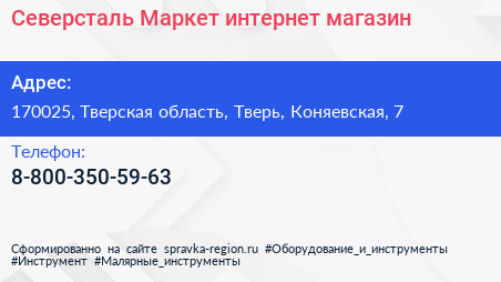 Северсталь Маркет, интернет-магазин по адресу 170025, Тверская область, Тверь, Коняевская, 7 в дальнейшем Организация, размещена в следующих категориях: