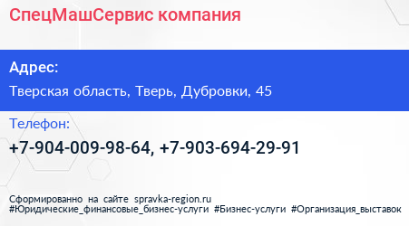 СпецМашСервис, компания по адресу Тверская область, Тверь, Дубровки, 45 в дальнейшем Организация, размещена в следующих категориях:
