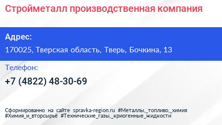 Стройметалл, производственная компания по адресу 170025, Тверская область, Тверь, Бочкина, 13 в дальнейшем Организация, размещена в следующих категориях: