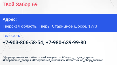 Твой Забор 69 по адресу Тверская область, Тверь, Старицкое шоссе, 17/3 в дальнейшем Организация, размещена в следующих категориях: