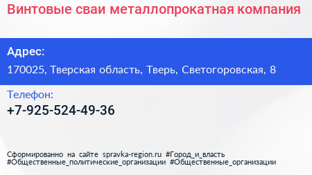 Винтовые сваи, металлопрокатная компания по адресу 170025, Тверская область, Тверь, Светогоровская, 8 в дальнейшем Организация, размещена в следующих категориях: