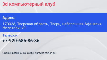 3d, компьютерный клуб по адресу 170026, Тверская область, Тверь, набережная Афанасия Никитина, 54 в дальнейшем Организация, размещена в следующих категориях: