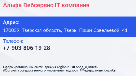 Альфа Вебсервис, IT-компания по адресу 170039, Тверская область, Тверь, Паши Савельевой, 41 в дальнейшем Организация, размещена в следующих категориях: