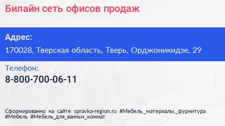 Билайн, сеть офисов продаж по адресу 170028, Тверская область, Тверь, Орджоникидзе, 29 в дальнейшем Организация, размещена в следующих категориях: