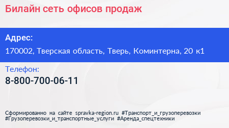Билайн, сеть офисов продаж по адресу 170002, Тверская область, Тверь, Коминтерна, 20 к1 в дальнейшем Организация, размещена в следующих категориях:
