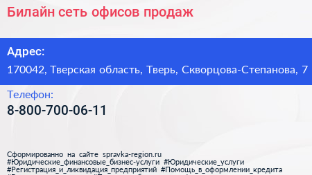 Билайн, сеть офисов продаж по адресу 170042, Тверская область, Тверь, Скворцова-Степанова, 7 в дальнейшем Организация, размещена в следующих категориях: