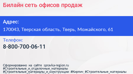 Билайн, сеть офисов продаж по адресу 170043, Тверская область, Тверь, Можайского, 61 в дальнейшем Организация, размещена в следующих категориях: