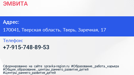 ЭМВИТА по адресу 170041, Тверская область, Тверь, Заречная, 17 в дальнейшем Организация, размещена в следующих категориях: