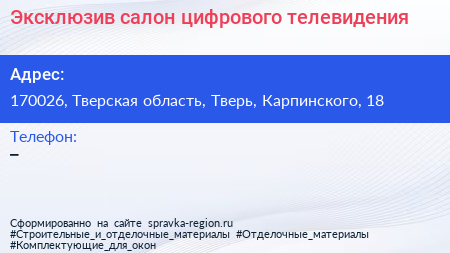 Эксклюзив, салон цифрового телевидения по адресу 170026, Тверская область, Тверь, Карпинского, 18 в дальнейшем Организация, размещена в следующих категориях: