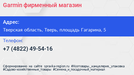 Garmin, фирменный магазин по адресу Тверская область, Тверь, площадь Гагарина, 5 в дальнейшем Организация, размещена в следующих категориях: