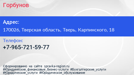 Горбунов по адресу 170026, Тверская область, Тверь, Карпинского, 18 в дальнейшем Организация, размещена в следующих категориях: