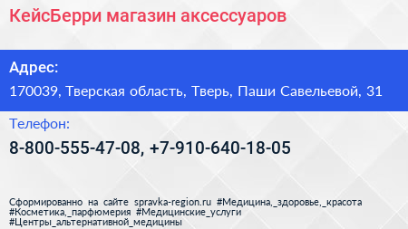 КейсБерри, магазин аксессуаров по адресу 170039, Тверская область, Тверь, Паши Савельевой, 31 в дальнейшем Организация, размещена в следующих категориях: