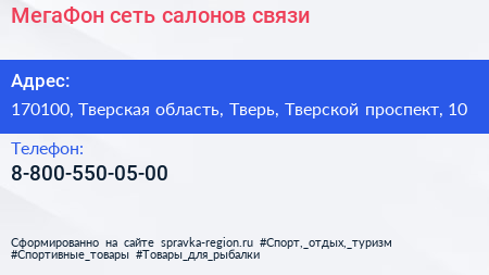 МегаФон, сеть салонов связи по адресу 170100, Тверская область, Тверь, Тверской проспект, 10 в дальнейшем Организация, размещена в следующих категориях:
