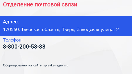 Отделение почтовой связи по адресу 170560, Тверская область, Тверь, Заводская улица, 2 в дальнейшем Организация, размещена в следующих категориях: