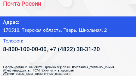 Почта России по адресу 170518, Тверская область, Тверь, Школьная, 2 в дальнейшем Организация, размещена в следующих категориях:
