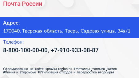 Почта России по адресу 170040, Тверская область, Тверь, Садовая улица, 34а/1 в дальнейшем Организация, размещена в следующих категориях:
