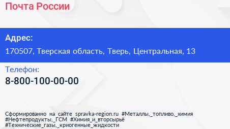 Почта России по адресу 170507, Тверская область, Тверь, Центральная, 13 в дальнейшем Организация, размещена в следующих категориях: