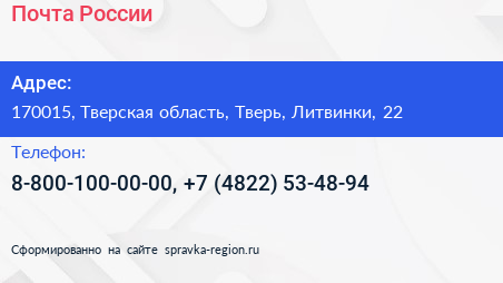 Почта России по адресу 170015, Тверская область, Тверь, Литвинки, 22 в дальнейшем Организация, размещена в следующих категориях: