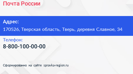 Почта России по адресу 170526, Тверская область, Тверь, деревня Славное, 34 в дальнейшем Организация, размещена в следующих категориях: