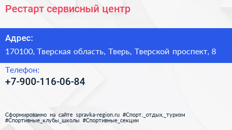 Рестарт, сервисный центр по адресу 170100, Тверская область, Тверь, Тверской проспект, 8 в дальнейшем Организация, размещена в следующих категориях: