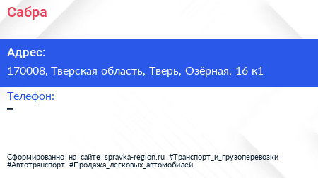 Сабра по адресу 170008, Тверская область, Тверь, Озёрная, 16 к1 в дальнейшем Организация, размещена в следующих категориях: