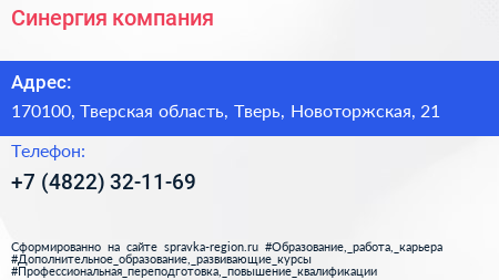 Синергия, компания по адресу 170100, Тверская область, Тверь, Новоторжская, 21 в дальнейшем Организация, размещена в следующих категориях: