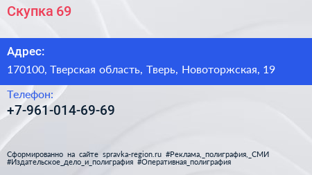 Скупка 69 по адресу 170100, Тверская область, Тверь, Новоторжская, 19 в дальнейшем Организация, размещена в следующих категориях: