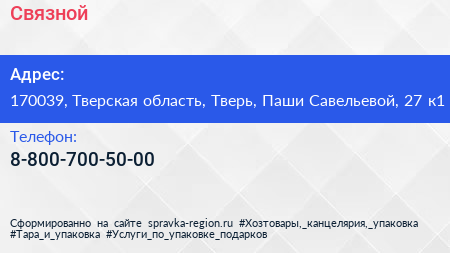 Связной по адресу 170039, Тверская область, Тверь, Паши Савельевой, 27 к1 в дальнейшем Организация, размещена в следующих категориях: