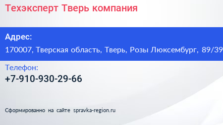 Техэксперт Тверь, компания по адресу 170007, Тверская область, Тверь, Розы Люксембург, 89/39 в дальнейшем Организация, размещена в следующих категориях: