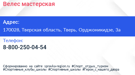 Велес, мастерская по адресу 170028, Тверская область, Тверь, Орджоникидзе, 3а в дальнейшем Организация, размещена в следующих категориях: