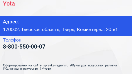 Yota по адресу 170002, Тверская область, Тверь, Коминтерна, 20 к1 в дальнейшем Организация, размещена в следующих категориях: