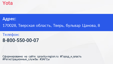Yota по адресу 170028, Тверская область, Тверь, бульвар Цанова, 8 в дальнейшем Организация, размещена в следующих категориях: